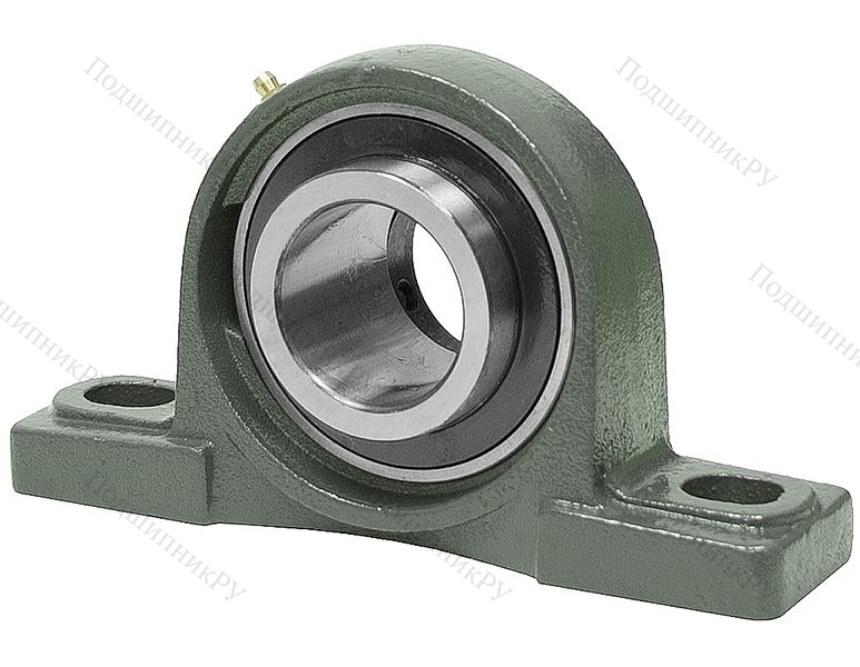 В конструкцию детали входит корпусный подшипник типа UC, установленный в корпус типа Р из чугуна с нишей сферической формы. Монтаж на вал осуществляется посредству кольца, оснащенного парой штифтов, закручиваемых шестигранником, что обеспечивает самовыравнивание.